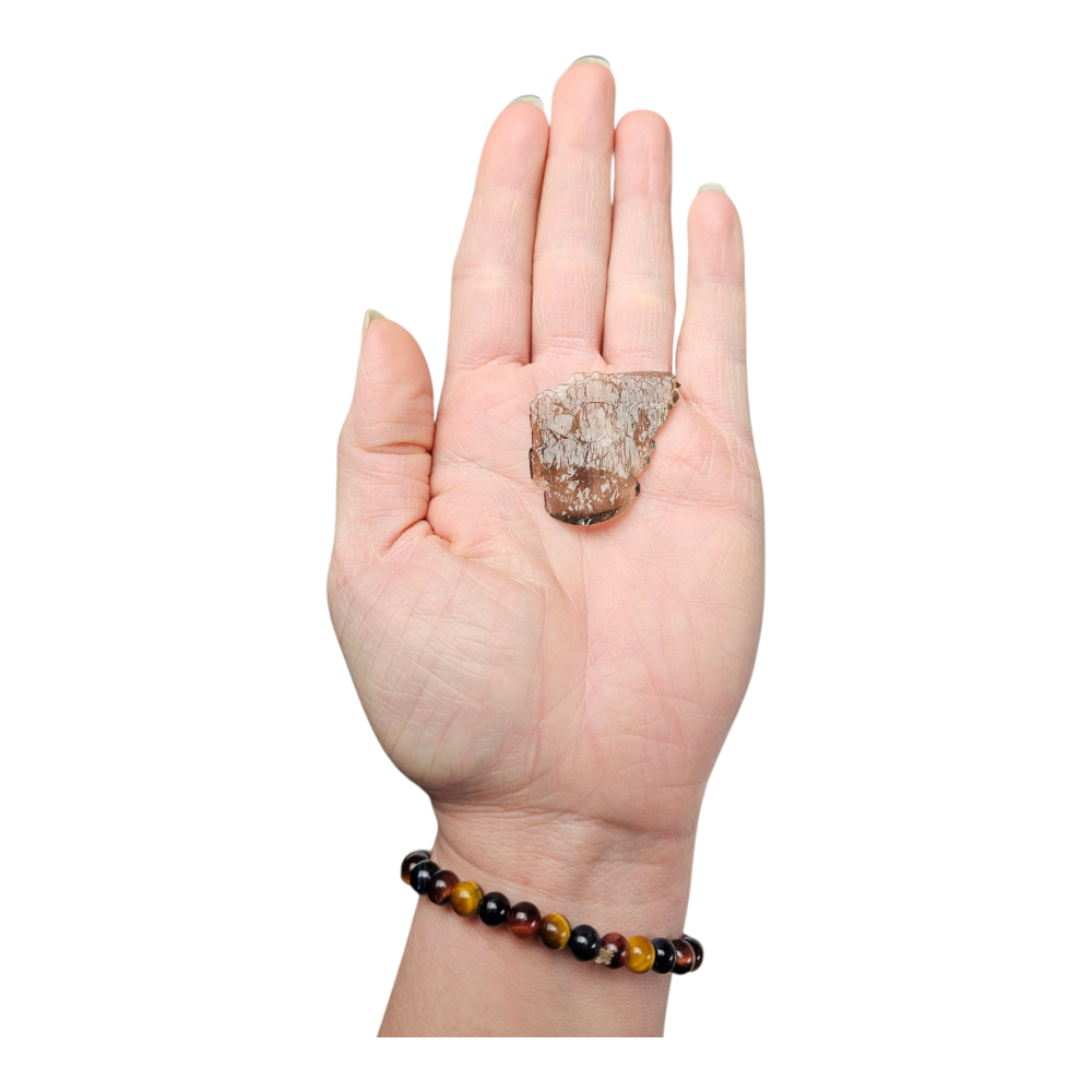 Découvrez ces tranches de Quartz Fumé Élestial, également appelé Quartz Jacaré ou Quartz Alligator, des cristaux rares caractérisés par leur structure en couches évoquant la peau d’un alligator.