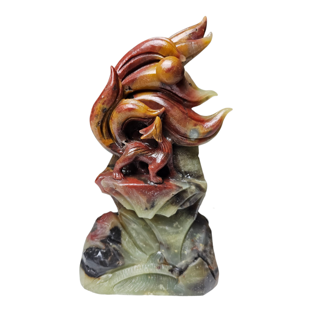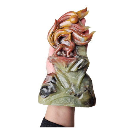 Ce Kitsune sculpté en Calcite de 800 grammes et 20 cm de hauteur est une pièce remarquable, alliant la symbolique spirituelle du renard japonais à l’énergie douce et apaisante de la calcite.