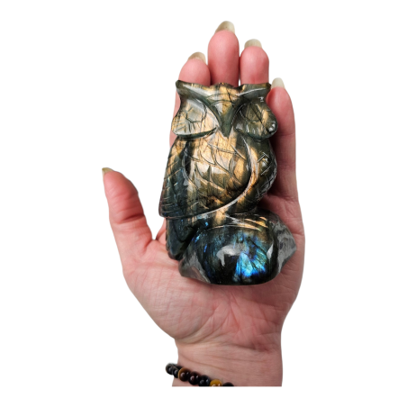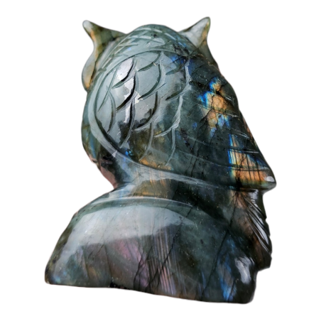 Ce hibou sculpté en Labradorite de 334 grammes et 9 cm de hauteur est une pièce à la fois symbolique et énergétique. La Labradorite, célèbre pour ses reflets irisés appelés labradorescence, est une pierre incontournable en lithothérapie pour ses propriétés de protection et de développement intuitif.