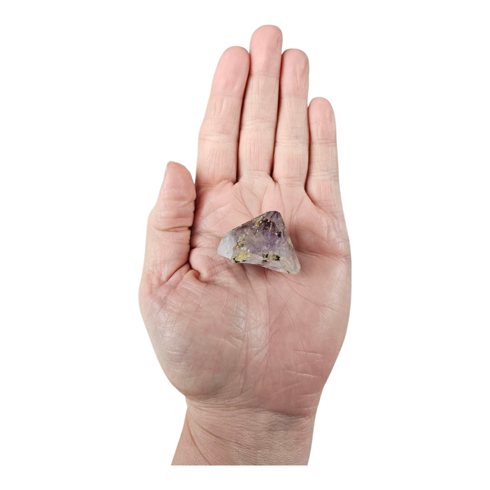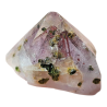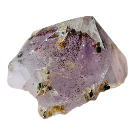 Magnifique pointe d'Améthyste du Sichuan. On peut y voir un magnifique fantôme et de belles inclusions. Elle comporte aussi des inclusions d'épidote (vert).