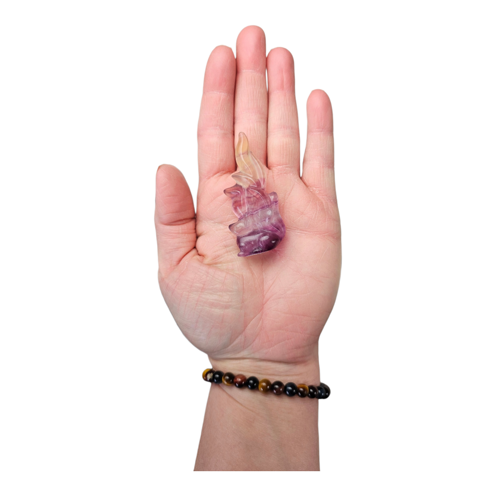 Ce Kitsune sculpté en Fluorite de 6 cm est une pièce délicate et symbolique, alliant la sagesse du renard japonais à l’énergie structurante de la Fluorite.