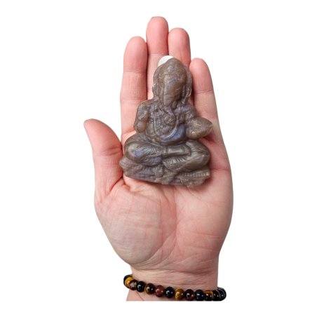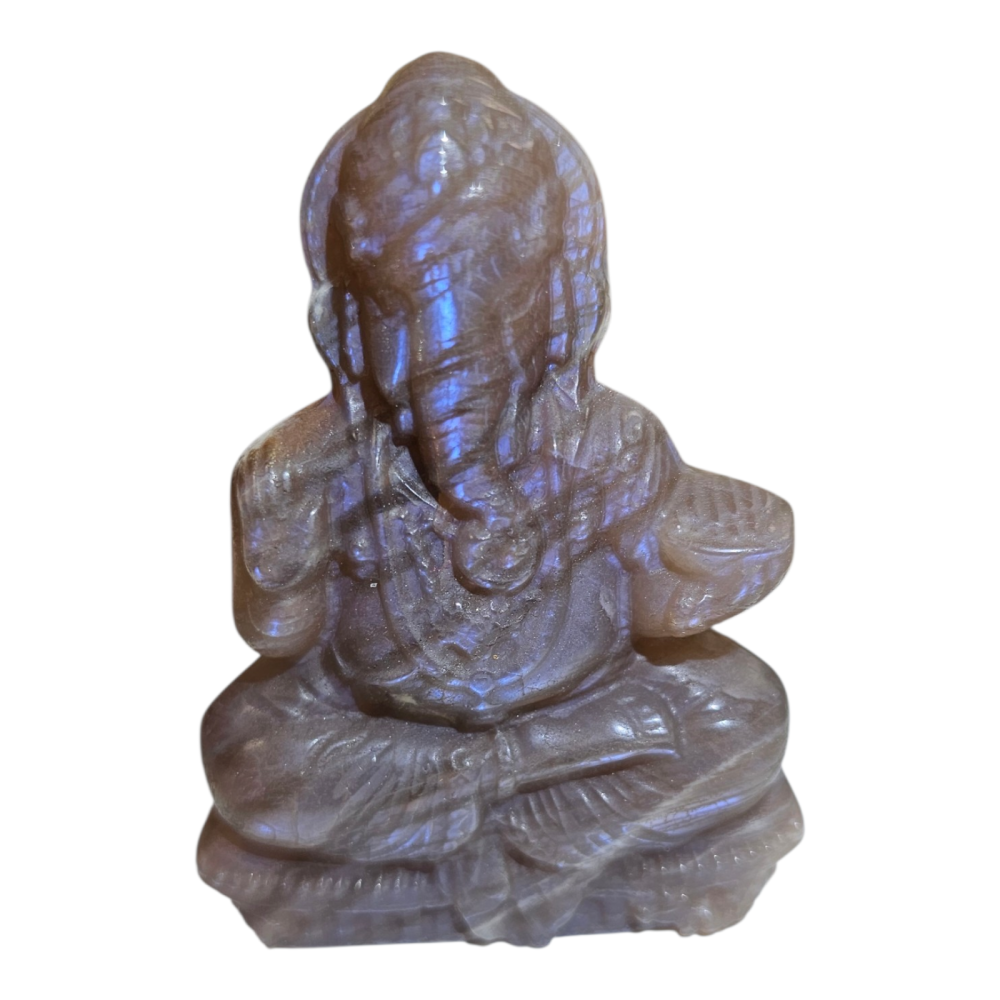 Ce Ganesh sculpté en Péristérite de 8 cm est une pièce spirituelle forte, associant la symbolique sacrée de Ganesh, dieu hindou des nouveaux départs, à l’énergie subtile de la péristérite, souvent appelée pierre de lune arc-en-ciel.